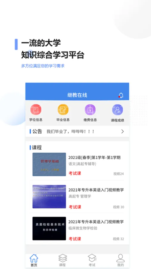 继教在线成教版,是由继教在线(北京)科技有限公司研发的一款面向成教学员的学习工具。学员在app上可以听课、做作业、练习、考试,也可以查询相关教学教务信息。