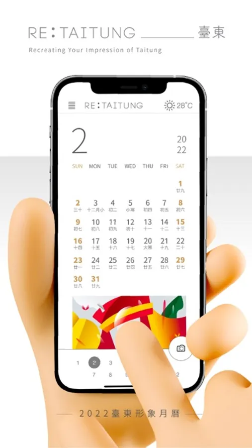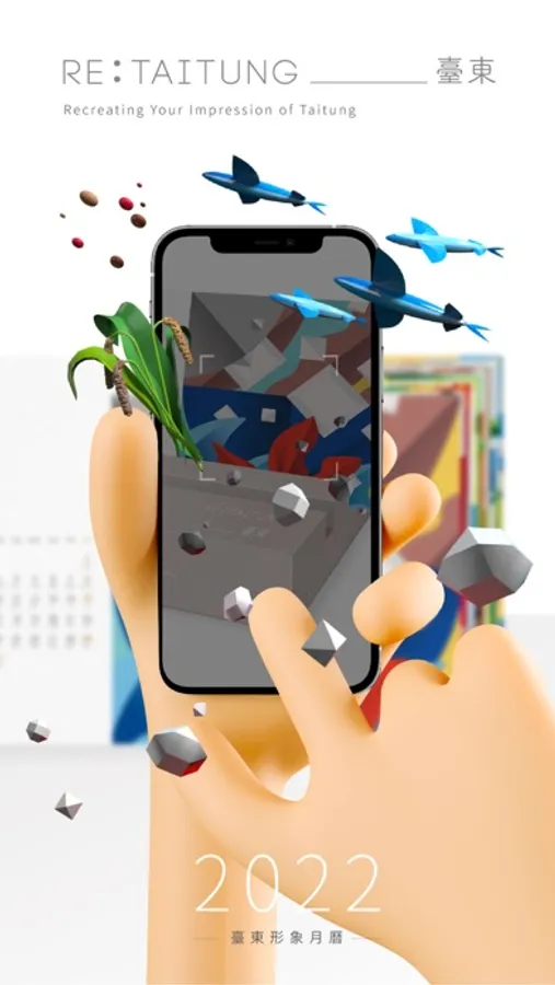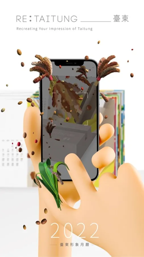 臺東形象月曆以「Re:Taitung _________ 臺東」為主題,留白的底線讓每個人填入自己心中對臺東的形容,Re:則具有回覆的意涵,讓此份月曆可以作為邀請函,熱情邀約所有人前來臺東,深度感受臺東特有的慢文化。