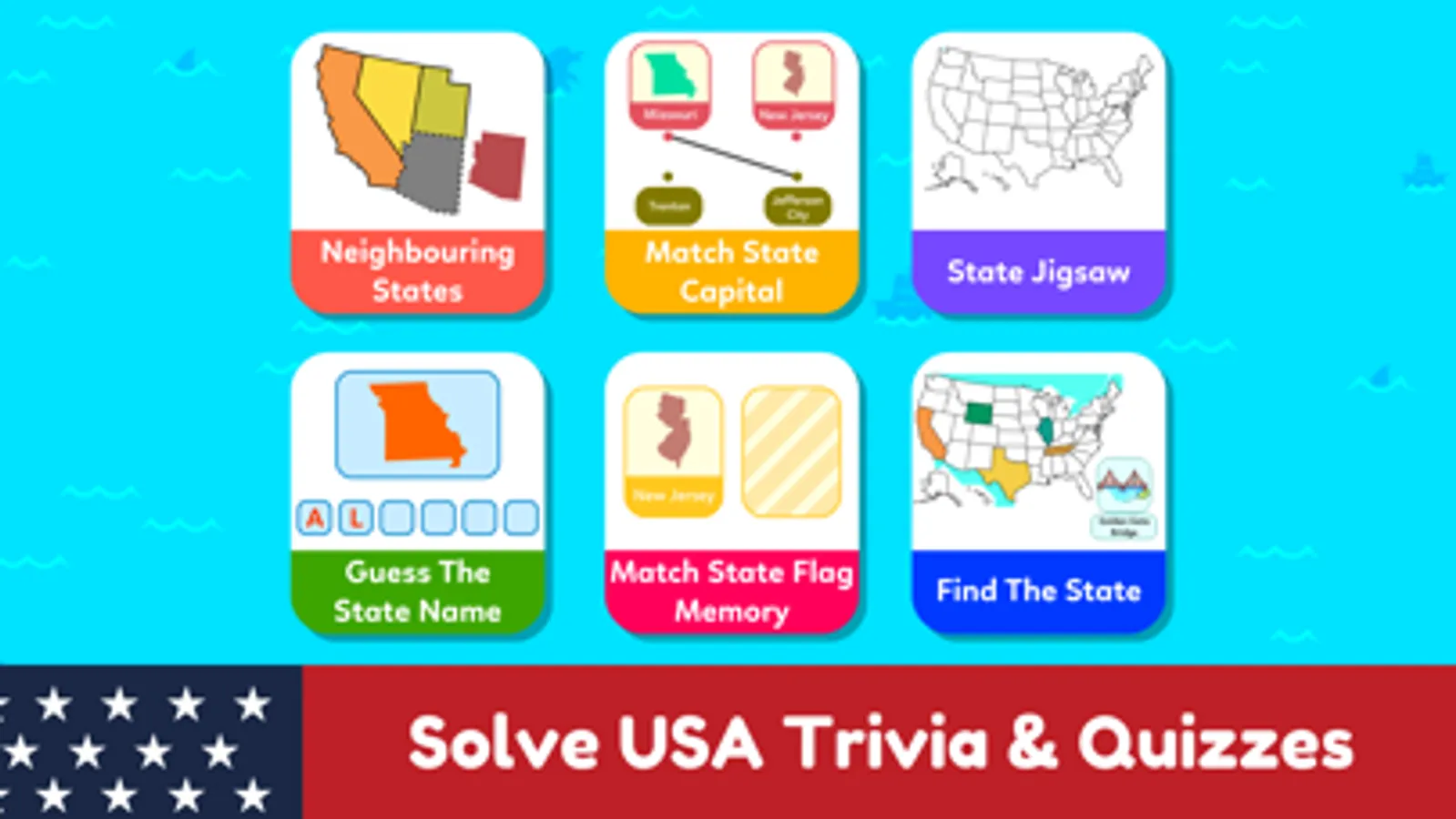 In this geography trivia & quiz game, you'll learn everything about the USA with fun entertaining mini-games. These educational mini-games include: