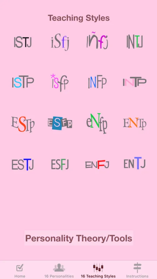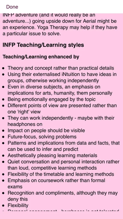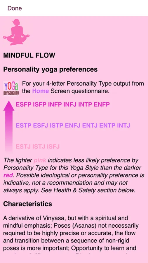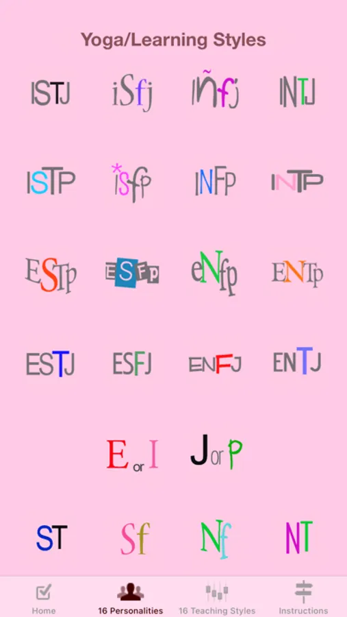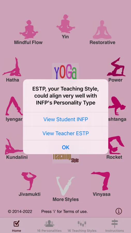 There are separate Yoga/Learning Style and Teaching Style screens for each of 16 Personality Types, and there is a handy save function for Yoga Personality Type.
