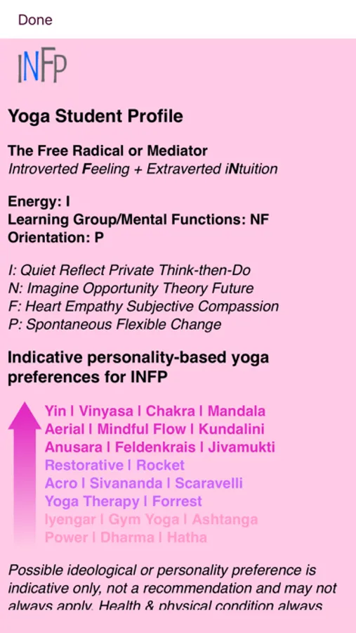 Note: This app is based entirely on likely PERSONALITY preference, so individual physical and health needs assessments must be the user's own. Likewise, any medical considerations must be self-assessed by the user and their doctor or qualified medical practitioner, as is the case for any exercise.
