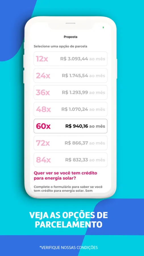 Para você que deseja o sistema de energia solar na sua empresa ou residência: use o nosso aplicativo para simular o seu kit solar fotovoltaico e escolher o parcelamento que cabe no seu bolso.
