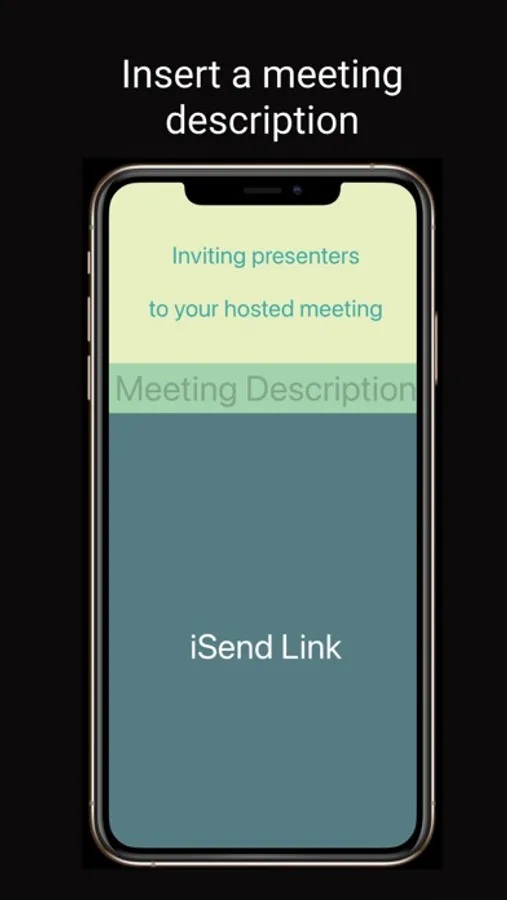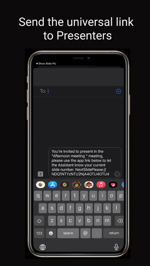 First of all, enter an appropriate “Meeting Description”, then iSend a meeting invitation via an iMessage to up to 7 presenters. Indeed, they need to have our Next Slide Please companion app installed to be able to join in.