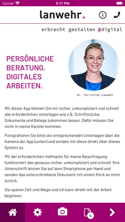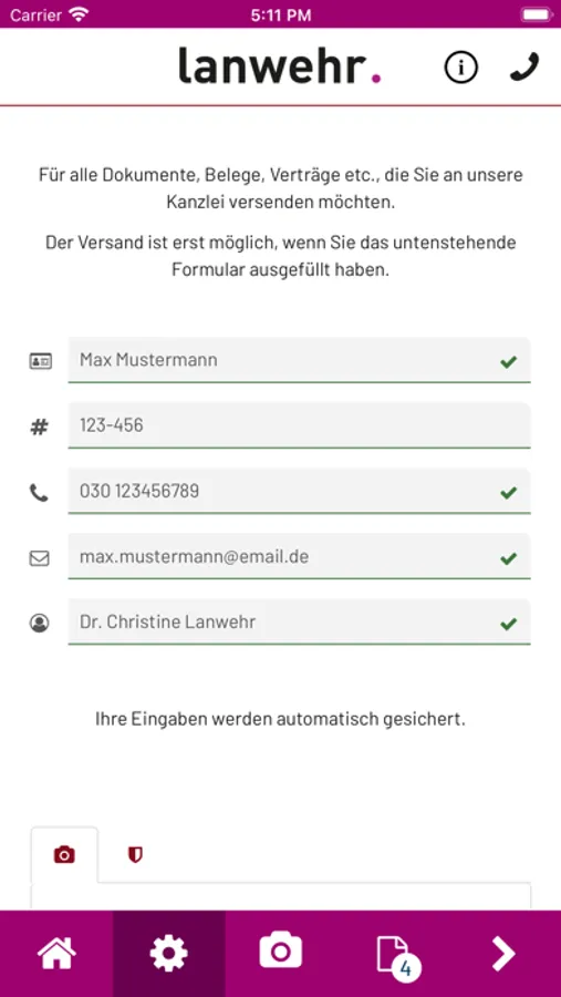 Machen Sie einfach ein oder mehrere Fotos von Ihren Dokumenten und versenden Sie diese mit einem Klick direkt aus der App heraus an lanwehr. erbrecht gestalten # digital
