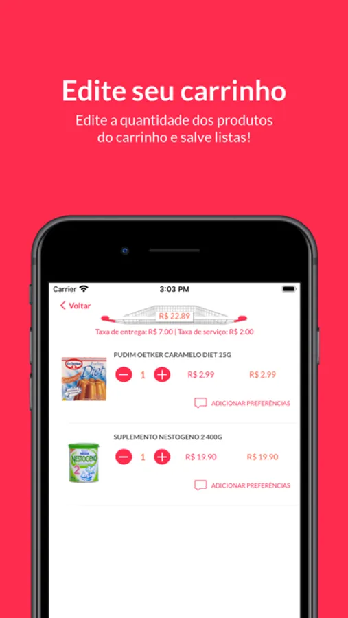 • Adicionar produtos no seu carrinho com um simples tocar e arrastar.