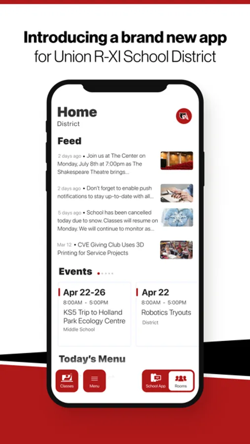 The event section shows a list of events throughout the district. Users can add an event to their calendar to share the event with friends and family with one tap.