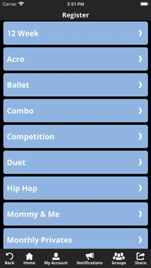 The Ms. Melinda's Dance Studio app allows you to manage your account with ease, register for classes, workshops and pay your bill. You'll also receive important notifications about class changes, closings, registration openings, special announcements, and upcoming events.