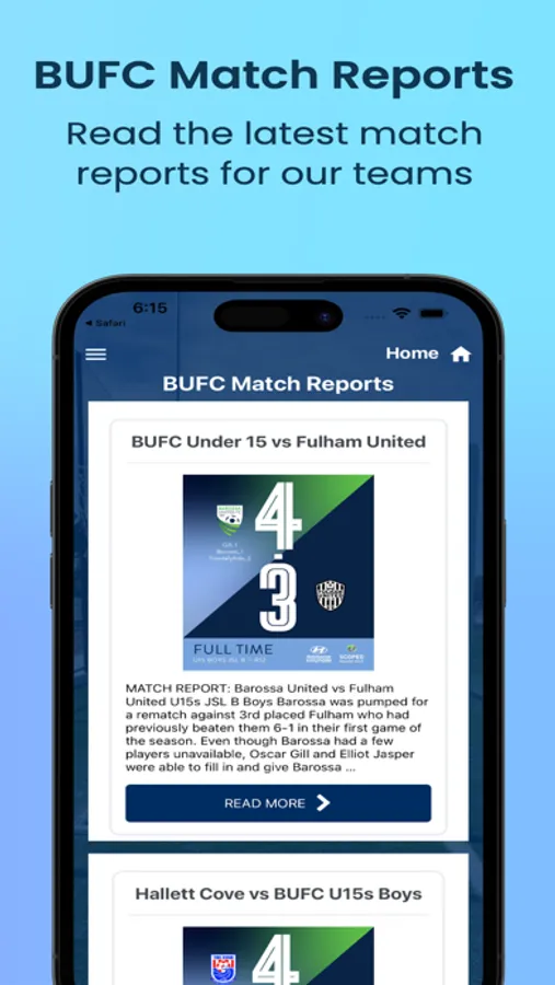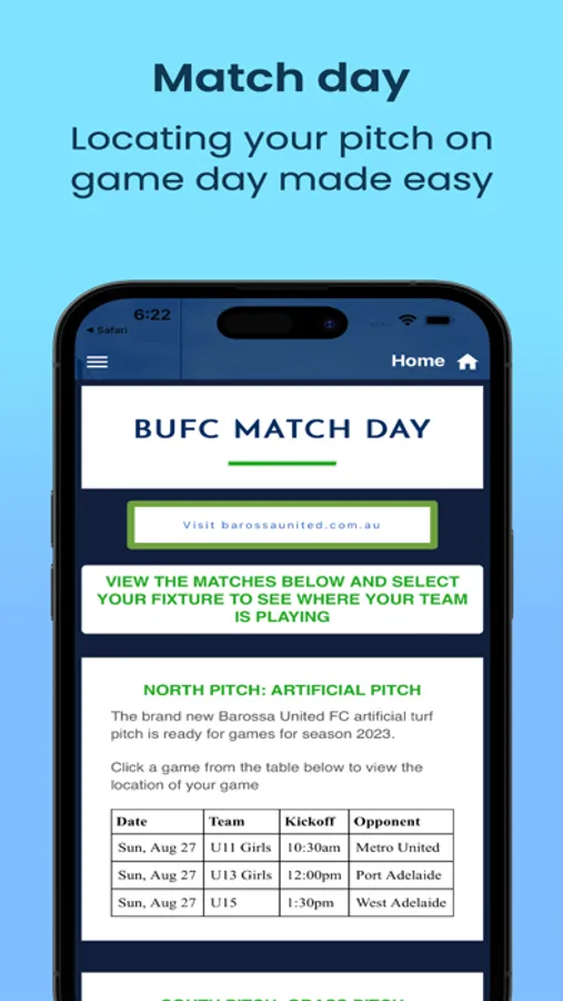 Get the latest news updates for Barossa United FC and see match reports for games across the club. View important upcoming events for BUFC and check out the latest results for our teams Under 12 and above. See information about individual teams and training days and times. View our sponsors who help to keep our club thriving and growing. Registered Barossa United members can log in and soon access special member benefits from our sponsors.