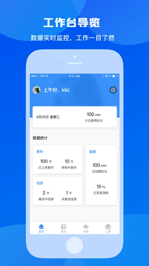● 支持奥点云账户信息查询:云素材存储量、私有区存储量、推流信源统计、直播时长统计。