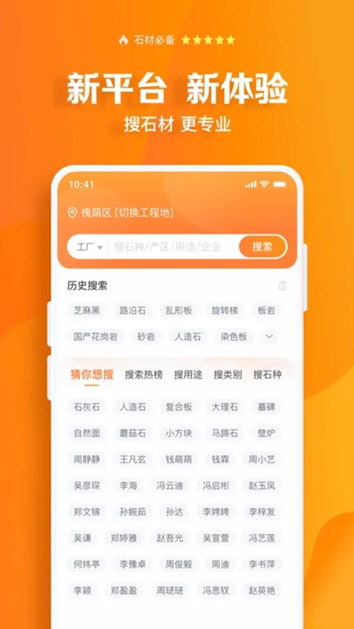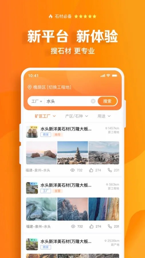 新平台,新体验,更符合个人搜索习惯,让使用者更容易的搜索到自己想要的石材,涵盖了关键字、石种、用途、产区、距离、商家或厂家、相似石材等因素,让您找到更近,更优,更实惠的好石材。