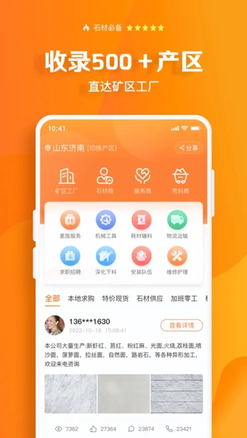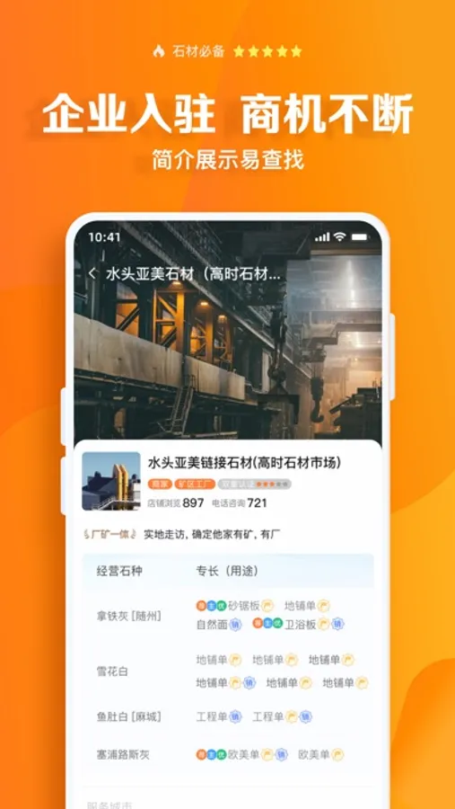 石材链-是2022年新推出的石材行业的综合性社交平台,平台包含近500多个石材产区,超过20000+优质石材企业,所有企业通过平台调研员实地走访,信息真实有效。是建筑工程,建筑材料,装饰装修,园林幕墙,市政工程,材料采购等相关人员的好助手。