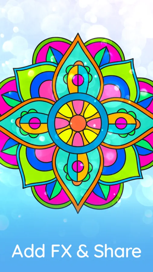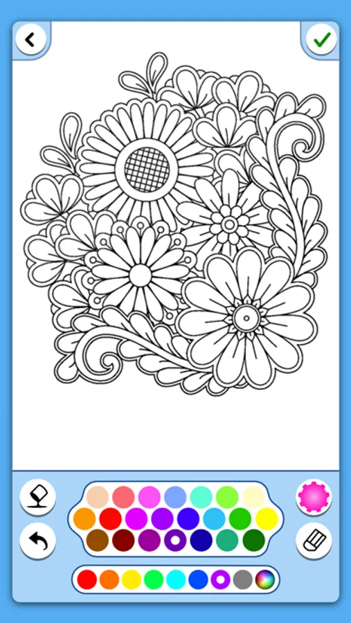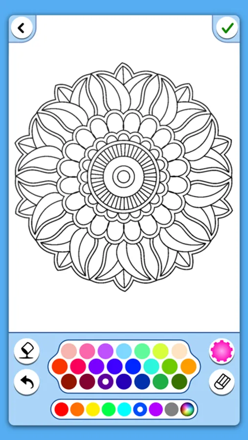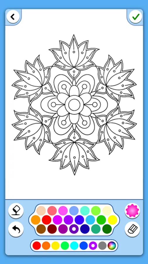 Flower mandala coloring pages both easy and complex. For everyone to enjoy and relax. Choose the desired color and tap the area you want to color. You can also choose a different pattern for each area. This way you can make a petal look even more like a real leaf.