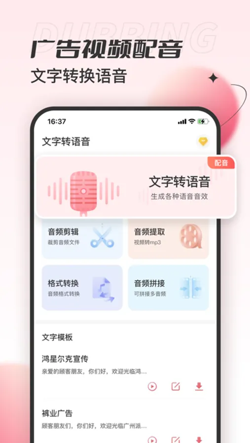 文字转语音是一款可以进行广告视频配音的工具,支持任意文本内容的便捷配音。适用于广告促销配音,自媒体视频配音,地摊叫卖配音等多种场景。