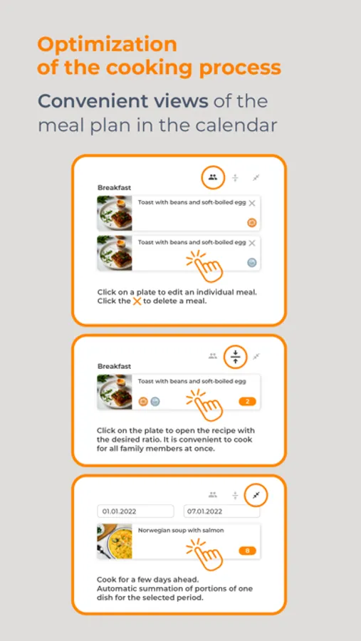 MEAL CALENDAR with a menu for one person or for the whole family (up to 6 people) and with a list of all planned meals, allows you to literally manage your meals "in the palm of your hand".