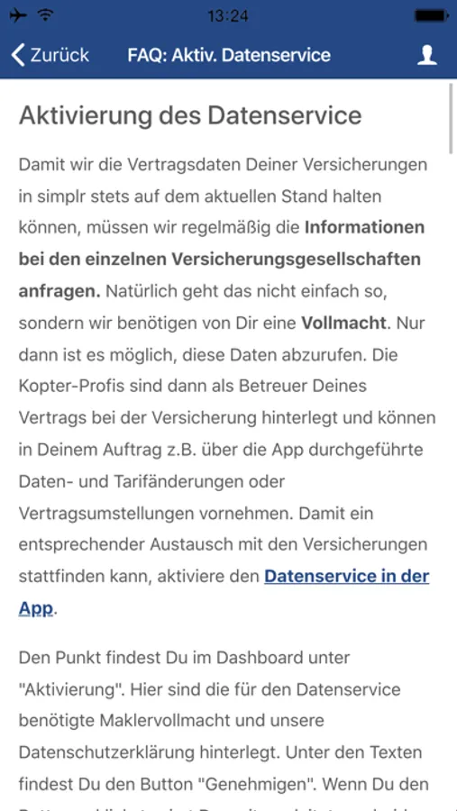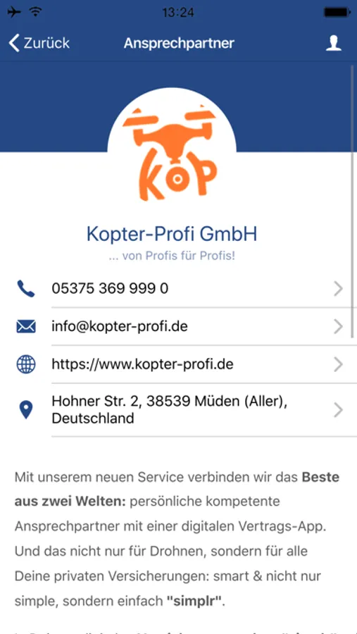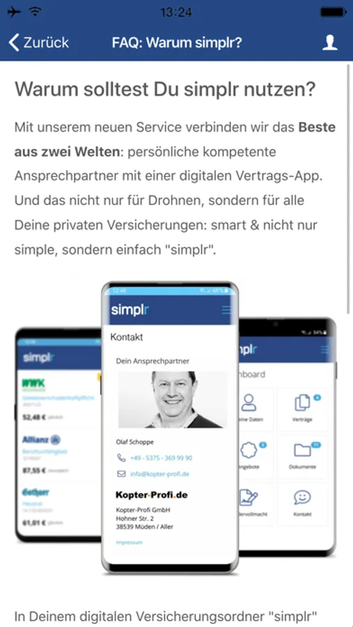 Mit diesem Service verbinden die Kopter-Profis das Beste aus zwei Welten: persönliche kompetente Ansprechpartner mit einer digitalen Vertrags-App. Und das nicht nur für Drohnen, sondern für alle Deine privaten Versicherungen: smart & nicht nur simple, sondern einfach "simplr".