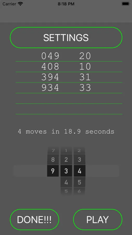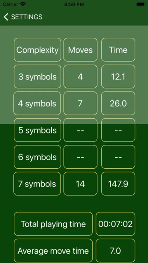 You have unlimited time and attempts to guess the secret code. Timer STARTS after you chose first symbol on picker wheels. As result of each attempt you will have a table with attempt and 2-digit attempt result in each row. First digit tells you how many symbols you guessed, second - how many symbols are in the correct positions.