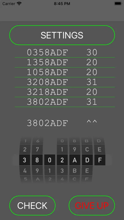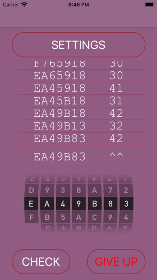 Depending on game settings code may contain from 3 to 7 symbols. For easy levels with 3 or 4 symbols, secret code is formed only from digits: 0, 1, 2, 3, 4, 5, 6, 7, 8, 9. For 5- to 7-symbol code it is formed from 0-9 digits plus A, B, C, D, E, F letters.