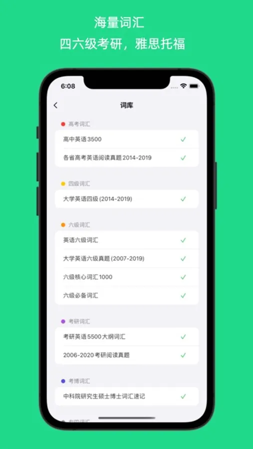 * 「在线词库」:小学/中考/高考/四级/六级/考研/考博/专四/专八/雅思/托福/GRE/SAT/GMAT/BEC/MBA/托业/专升本/Coca/全国英语等级考试PETS/剑桥英语考试KET/PET/FCE/ACT/成人本科等词库;