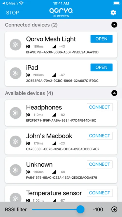 Qorvo Connect allows you to explore and interact with your Bluetooth® Low Energy (Bluetooth LE) devices. You can scan for them, read and decode their advertisement data, connect with them and interact with their services an characteristics.