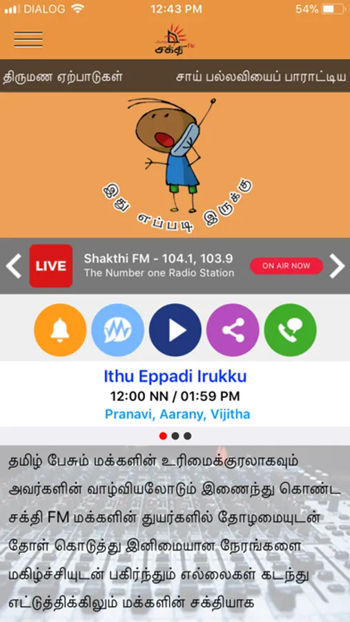 Shakthi FM Mobile app offers a variety of features to empower you to have a wider engagement with the radio station than ever before. Unlike in the conventional radio experience, where you only get to listen, Shakthi FM Mobile app offers you the visual radio features with more interactivity with the programs and DJs you wish to follow. Shakthi FM Mobile app is a property of MBC Networks.