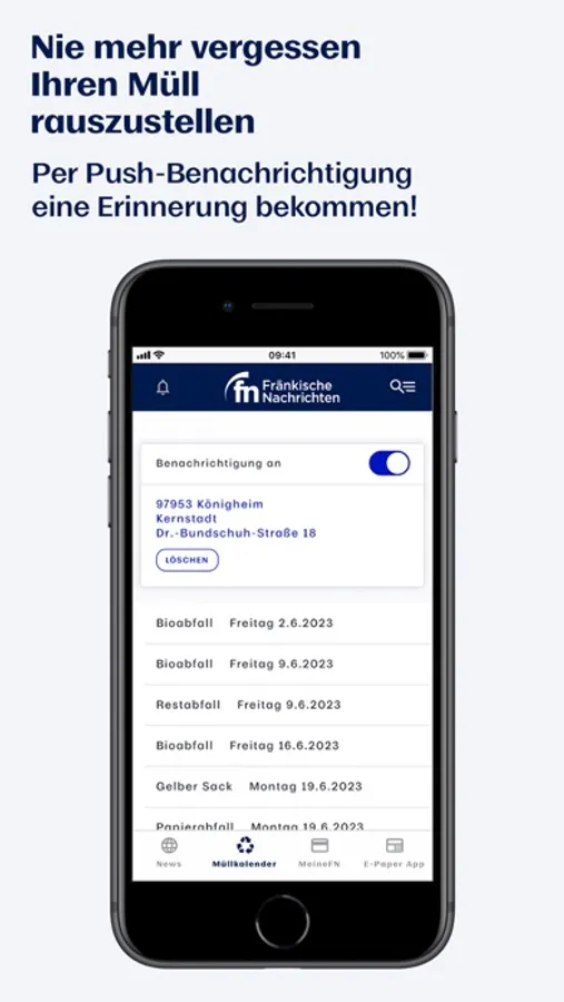 + Zusätzlich mit der kostenlosen Funktion für Ihren Rest-, Bio- und Papierabfall sowie die Abholung des Gelben Sacks einen Müllpush einrichten – Sie bekommen immer einen Tag vorher sowie am Tag der Abholung eine Erinnerung. Sie gehen damit keine Abo-Verpflichtung ein.