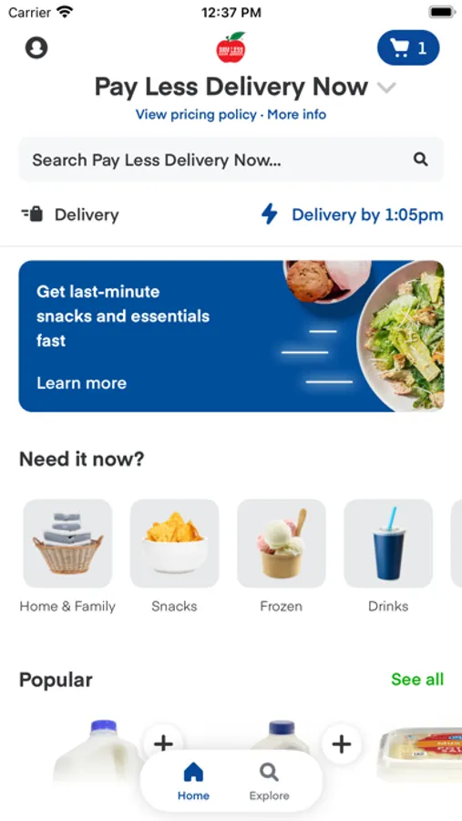 Delivery Now puts quality, convenience, and speed right at your fingertips. Simply download the app and create an account to receive essentials in as little as 30 minutes. We offer delivery from your mobile device to your front door, all from your trusted local Pay Less.
