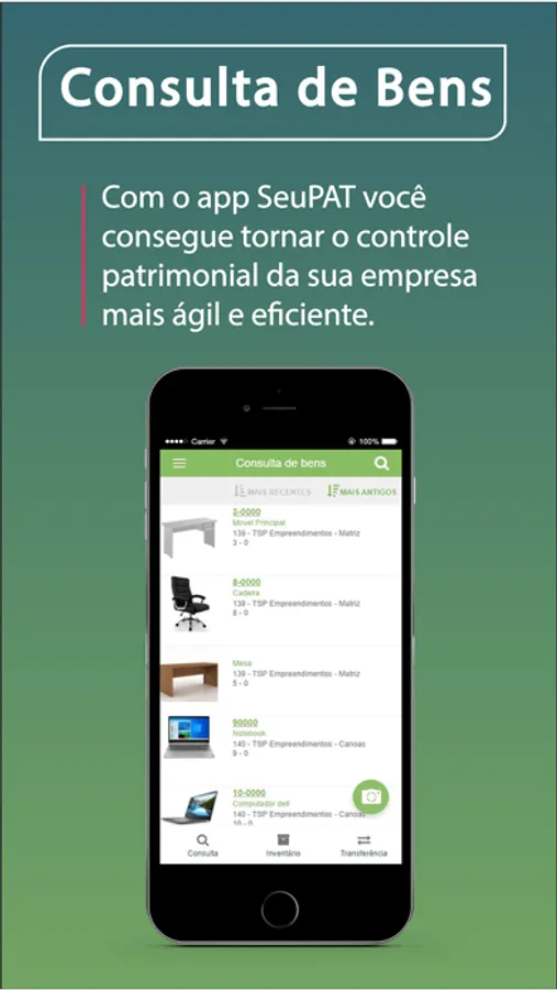 O app SeuPAT oferece mais uma funcionalidade para a área de Patrimônio da sua empresa a partir de smartphones, tablets e outros dispositivos habilitados para internet. A partir do app é possível fazer a consulta de bens da empresa, além de gerenciar informações importantes em tempo real e de qualquer lugar do mundo.