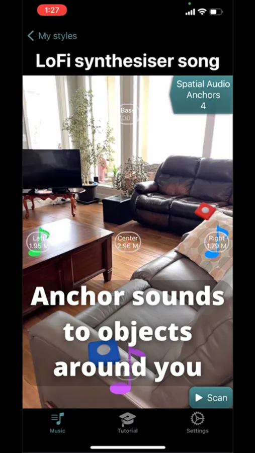 —Spatial audio allows musical tracks to be anchored to surfaces in the real world. In each style, select Spatial Audio Anchors using the button on the top right corner. The topmost musician will play right away. The other musicians will play a “tap” until you click the “Play” button. After you click play, the musicians will all play together. If you click the “Sync all” button, the anchored musicians will synchronize with the scanned musicians.