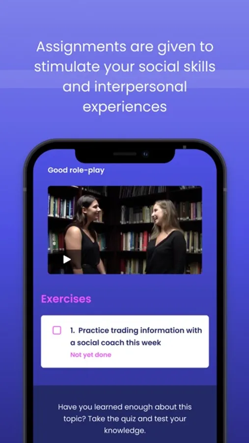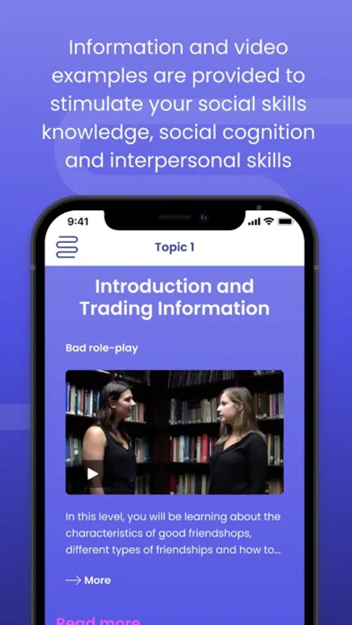 The PEERS® app helps you with making and keeping friends. It provides you with information, video examples and assignments to stimulate your social cognition, skills, and experiences. Textual information is given to educate you about social situations. Video role-play examples are provided to illustrate a) behaviors that are less helpful to make and keep friends, and b) behaviors that are more helpful to make and keep friends. The assignments will help you practice and apply the learned social skills to your daily life.
