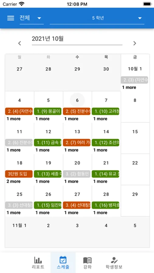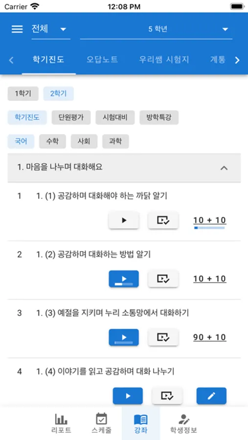 - 강좌별 학습결과 : 1,2학기 학기진도, 단원평가, 시험대비, 방학특강 학습결과