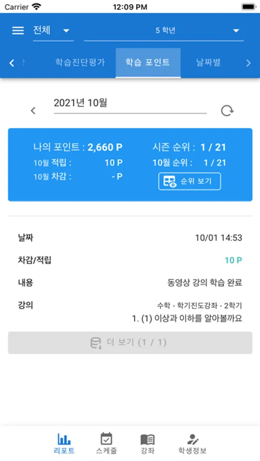 학습 리포트 및 통계, 날짜별/강좌별/학생별 학습결과를 확인할 수 있습니다.