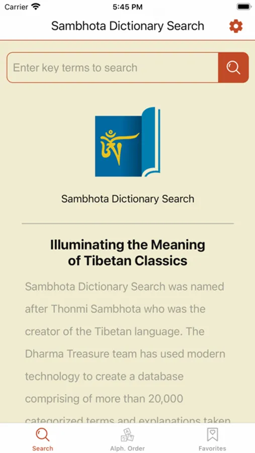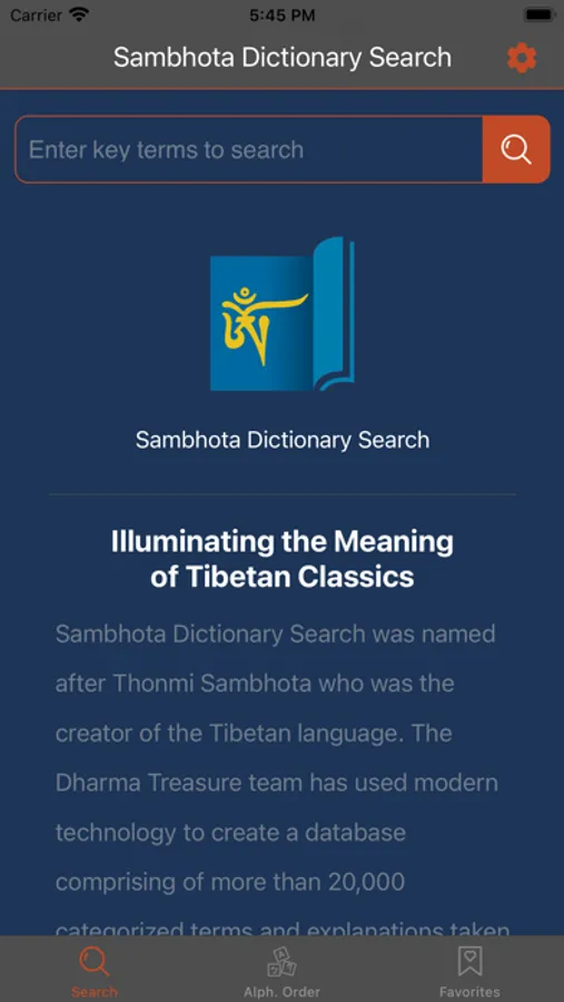 Sambhota Dictionary Search was named after Thonmi Sambhota who was the creator of the Tibetan language. The Dharma Treasure team has used modern technology to create a database comprising of more than 20,000 categorized terms and explanations taken from ancient and modern Tibetan dictionaries, Tibetan Chinese dictionaries, Chinese Tibetan dictionaries and others. Sambhota Dictionary Search is a great reference tool for users learning and studying the Tibetan language.