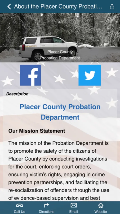 This app is for the employees of the Placer County Probation Department, their families, and the community they serve. This app contains information about the department as well as safety and crime prevention tips. The Placer County Probation Department's employees and their families will have access to a full range of wellness tools.