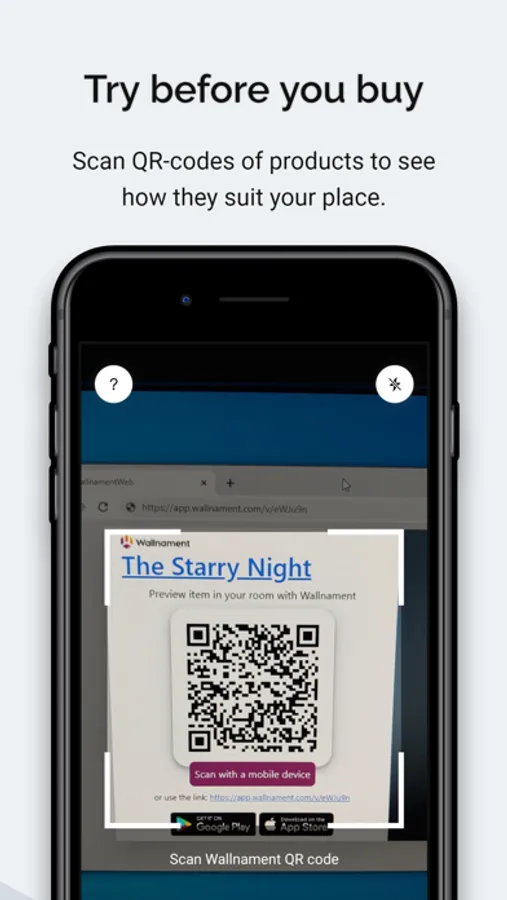 If you have a Wallnament QR-code of an item you found online, at a gallery or at a store, simply scan it with a built-in scanner. Then use our augmented reality (AR) technology to virtually hang and compare your chosen paintings, posters, stickers, photographs or other printouts and wall décor items. Get the most out of your purchase!