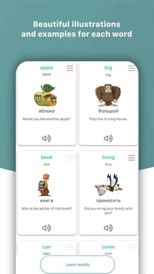 Learning English words, especially in the early stages of language learning, is very important in a real context. For this, we have selected several simple examples with dubbing and translation for each word. To work with words in context, you have different exercises at your disposal, as well as a separate opportunity to read all examples of any list.