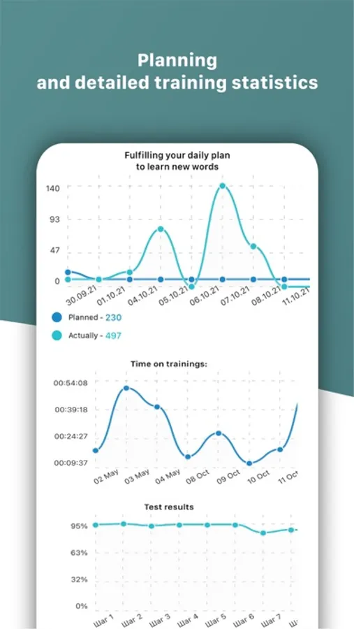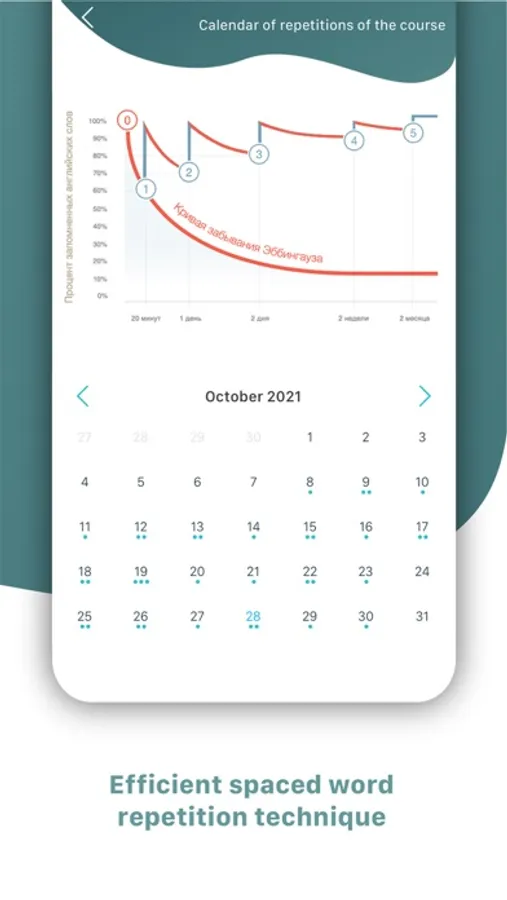 The application uses a built-in spaced repetition calendar based on the H.Ebbinghaus Forgetting Curve. This technique ensures the maximum efficiency of memorizing English words and guarantees a stable increase in the vocabulary of the English language.