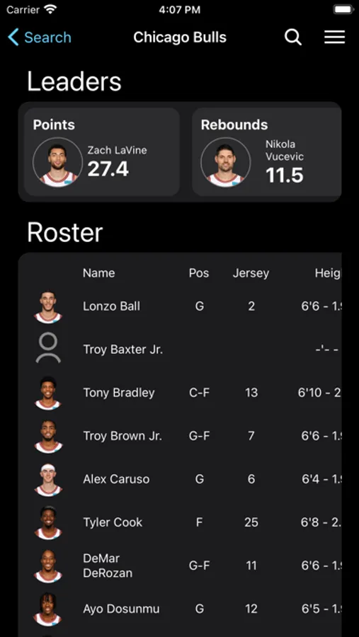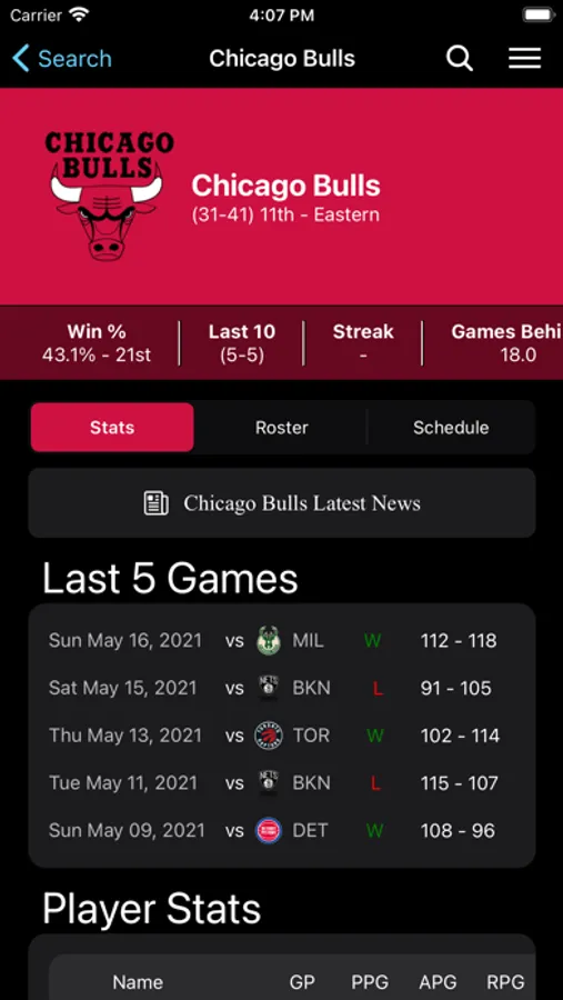 - Stats, roster & schedule of all teams in the league