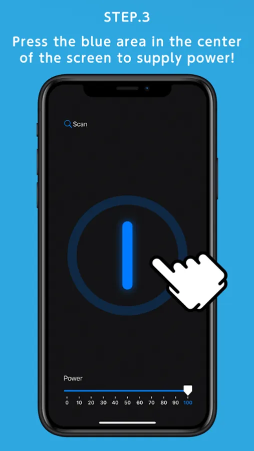 3. Press and hold the blue area in the center of the screen to start powering up!