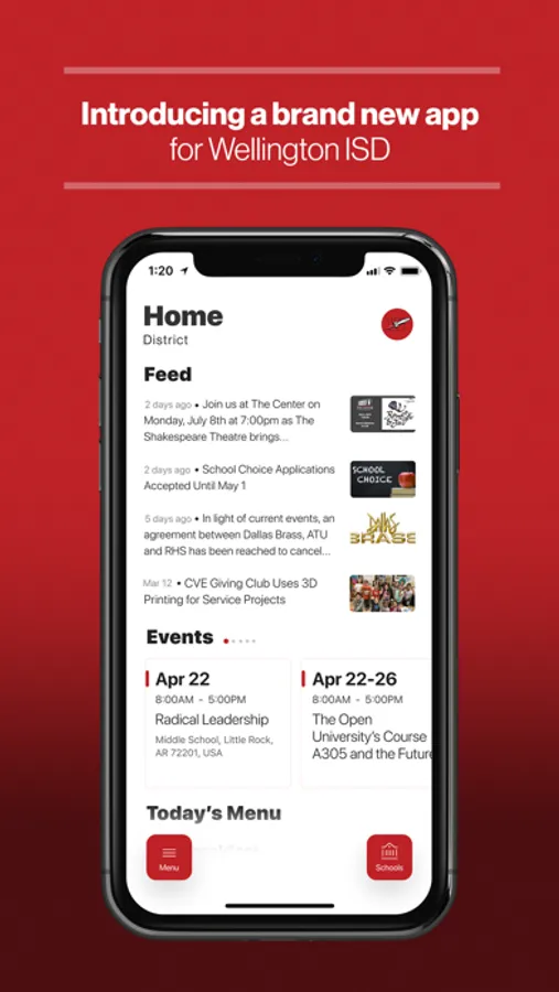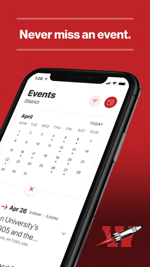 The event section shows a list of events throughout the district. Users can add an event to their calendar to share the event with friends and family with one tap.