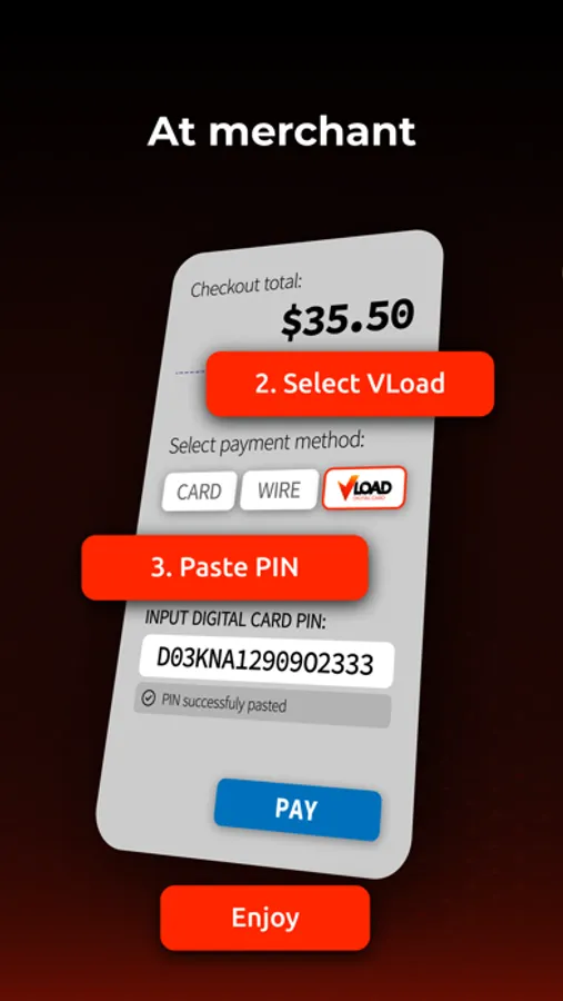 Each VLoad Digital Card is one-time use only and contains a unique PIN, which is entered at checkout with any online merchant that accepts VLoad. Each VLoad Digital Card you purchase will appear in the "My Cards" section of the app and in your account when you sign in at https://vloadcards.com . We will also email you a copy each time you buy VLoad.