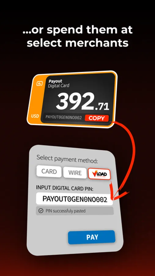 Use VLoad to load your account at your favorite online gaming website or brokerage platform. You can then cash out your winnings using a VLoad Payout Digital Card, which can be used to continue shopping in our Merchant Network or transfer the balance to your bank account using ACH transfer including Real Time Payments.
