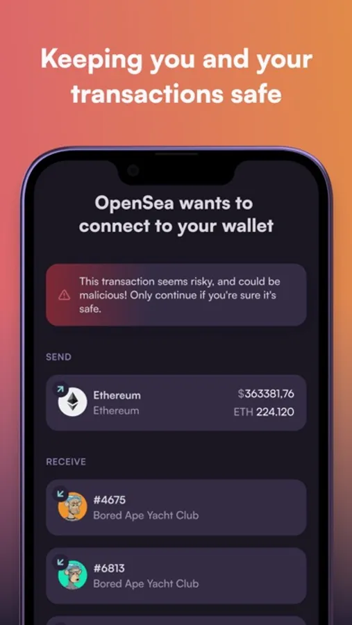 - Transact confidently with threat detection notifications, alerting you of potentially malicious contracts before you approve