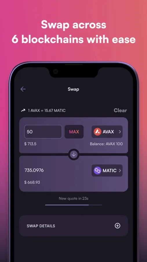 - Swap coins on and across all 6 supported blockchains without ever leaving the app