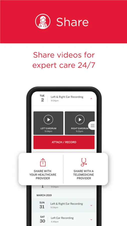 Use the SmartCheck® step-by-step in-app guide to properly align the device over your smartphone’s main camera to capture high-quality eardrum recordings. You can then share the recordings with a healthcare provider, all without leaving home.