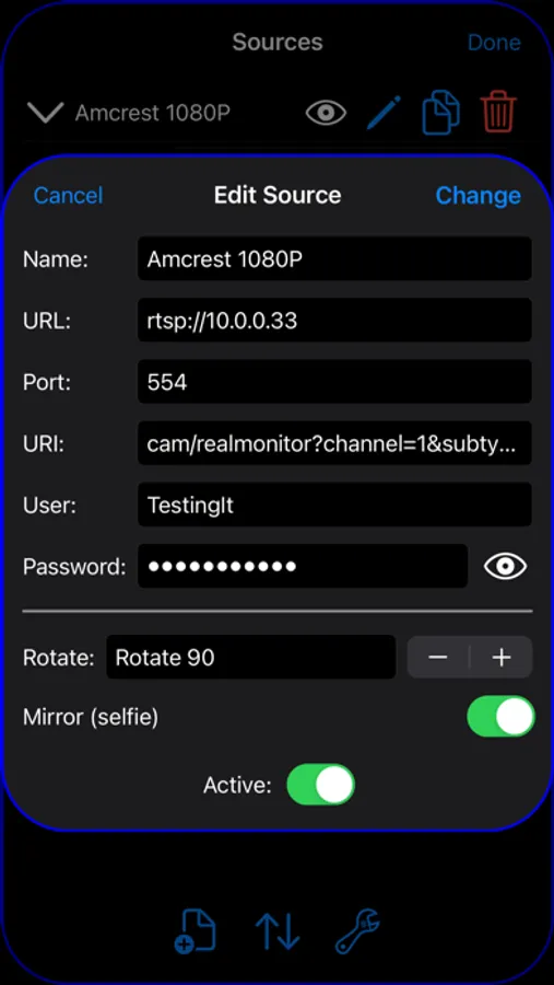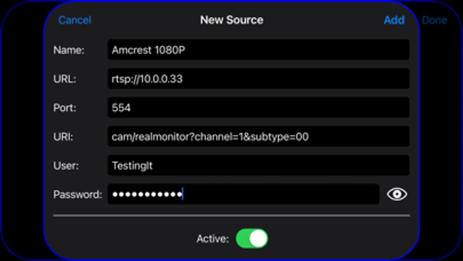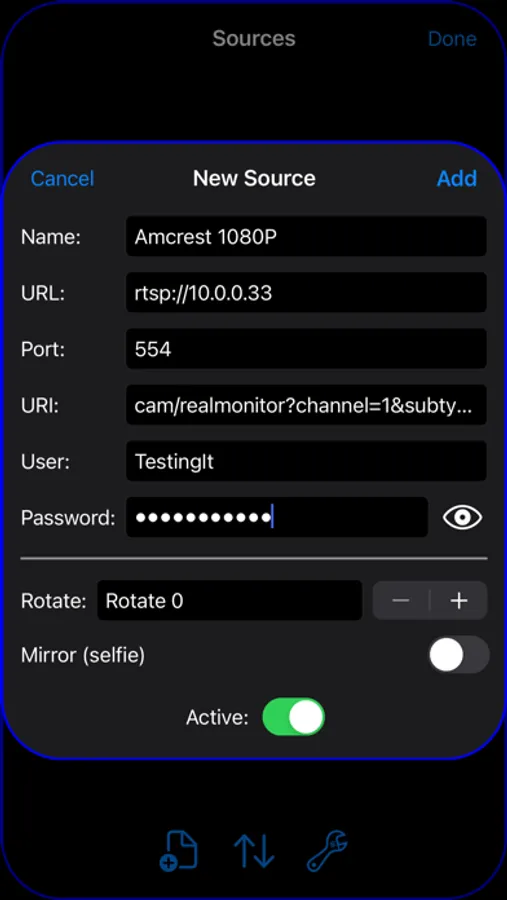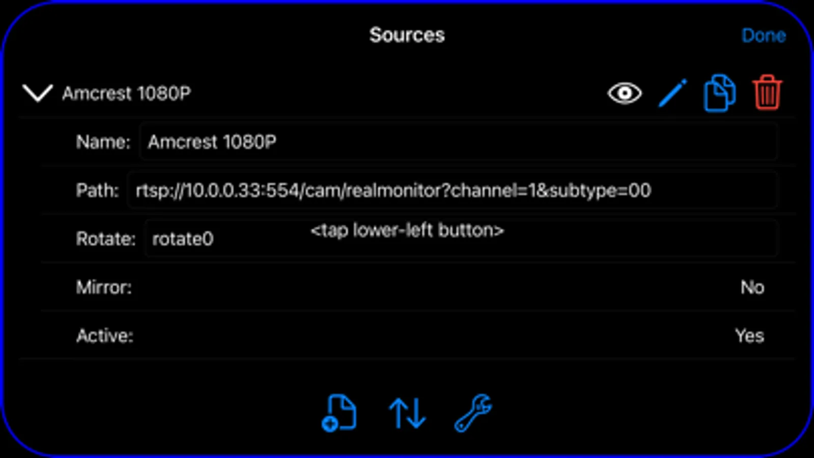P.S.: Knowledge of URL(s) for one or more rtsp compliant IP cameras connected to your local area network is required when utilizing the 'Sources' dialog (upper right-hand button on primary interface - the gear) to configure connection(s). Currently a web search is required to determine an rtsp URL for a given make and model of IP camera. Note, not all IP cameras have rtsp streaming support. Finally, actively monitored security system cameras may very well not support rtsp streams and/or can be encrypted, preventing any access to the video stream.