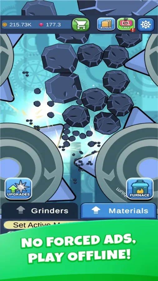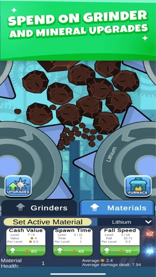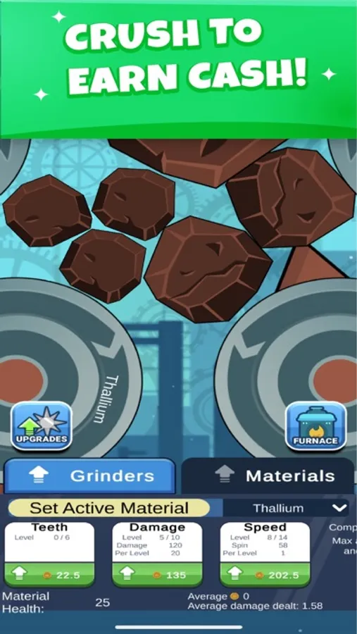 Spend the materials you grind up in the furnace to unlock the power of your grinders. Upgrade your grinders from the softest material all the way to diamond. You'll start weak but grow powerful in this incremental game!