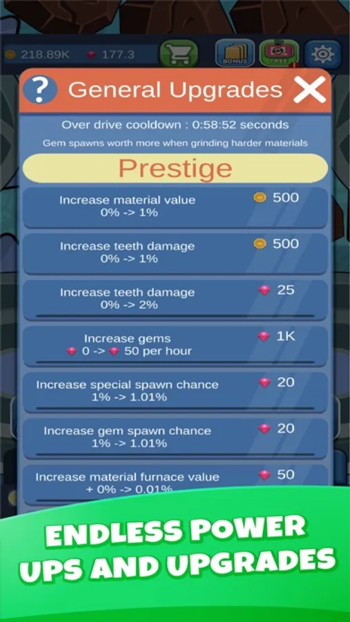 • Free to Play - Earn gems by grinding materials. Stronger materials are worth more!