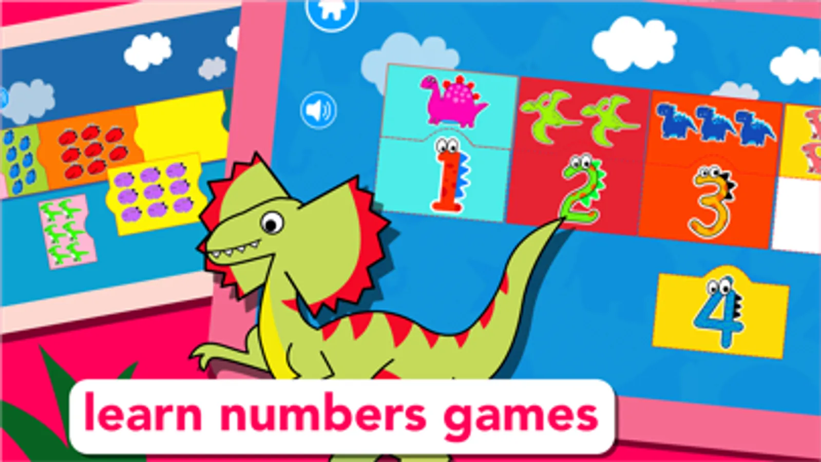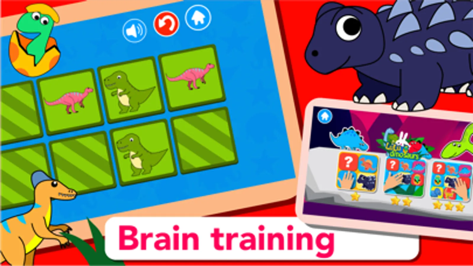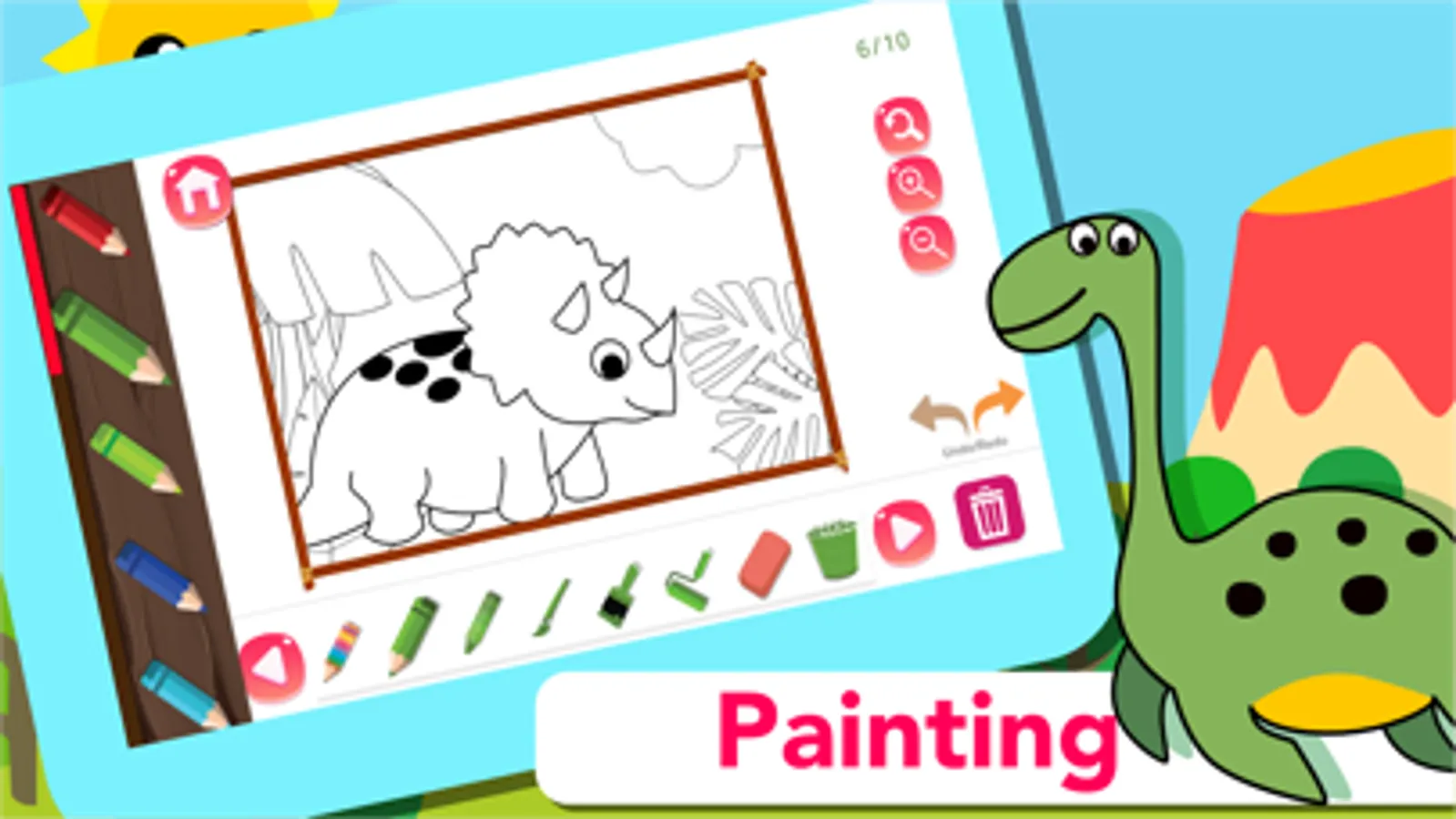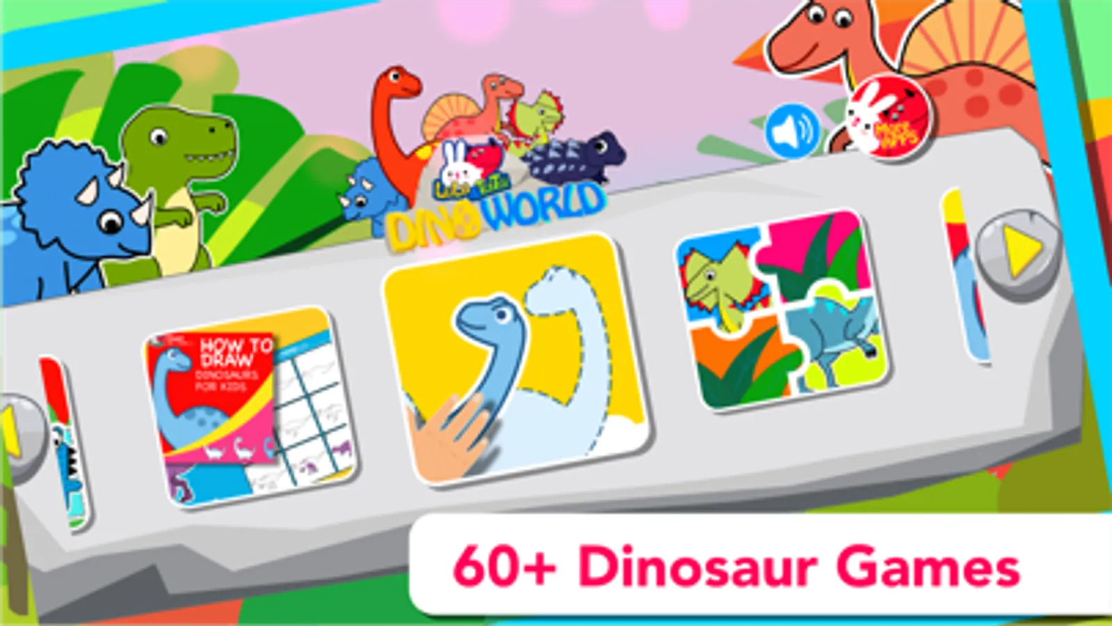 Dino World is a fun game for kids where you can discover the different species of dinosaurs with educational games (Puzzle, Hidden object, Drawing, Brain Training, Drawing Tutorials, Color match, Learning Numbers)