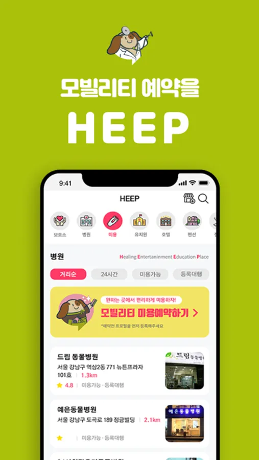 위치기반 동물 관련 업체 정보[보호소,동물병원,미용,애견유치원,동물 호텔,동물 펜션,동물 장례식] 까지 편하게 검색하고 예약하자.