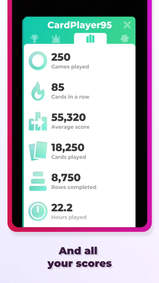 Head to your profile to view your highest score and interesting game statistics. You can see stats like the number of cards you've played, rows you've completed, and your total playtime. You can also view these stats for any other player by tapping on their usernames. Dive into your Solitaire achievements!